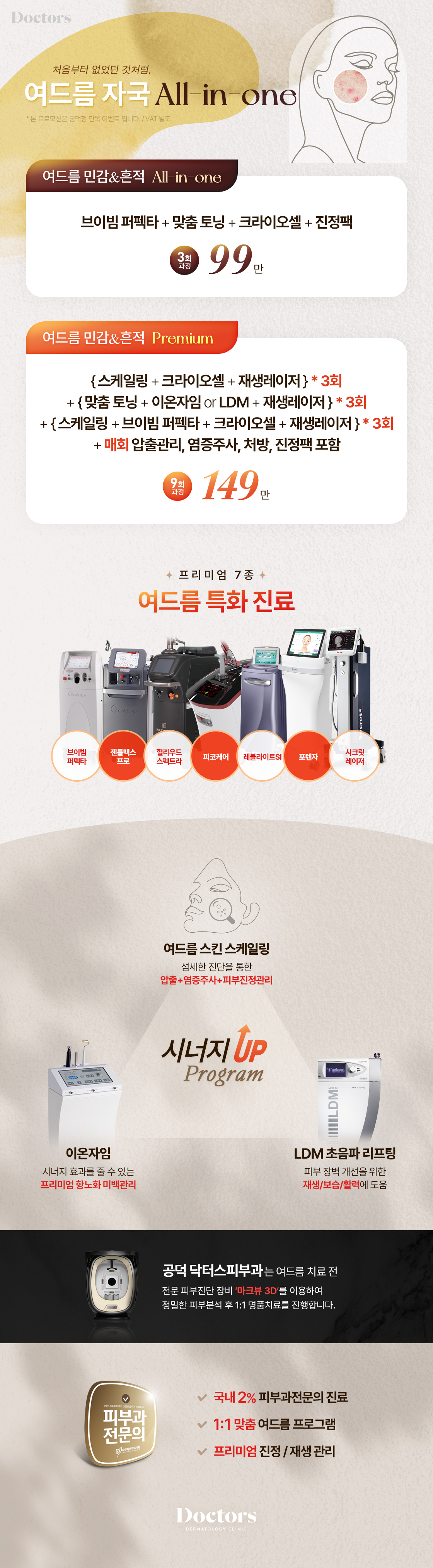 [스케일링 + 크라이오셀 + 재생레이저]*3회 + [맞춤 토닝 + 이온자임 or LDM + 재생레이저]*3회 + [스케일링 + 브이빔 퍼펙타 + 크라이오셀 + 재생레이저]*3회 + 매회 압출관리, 염증주사, 처방, 진정팩 포함